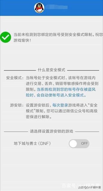 然后我们可以看到下面有个DNF安全锁的开关,我们打开DNF安全锁的开关即可继续保护我们的游戏安全环境,虽然不能说是绝对的安全,但是可以给我们的账号提供额外一层保护还是很不错的,毕竟这个版本很多玩家对账号投入了很多,不管是金钱还是时间都是我们慢慢玩起来的,谁的都不想就这么被盗对吧。