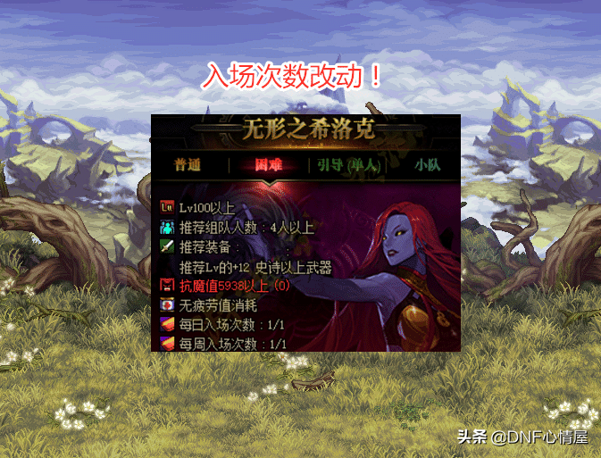 之前的时候,困难模式一周能打两次,然而,经过改动以后,限制为一次。不过,困难普通次数共享,即1困难+1普通或者2普通,玩家可以酌情选择。且困难模式相对于之前版本的困难模式血量防御不变,BOSS机制略微下调,但仍旧比普通强。因此,对于伤害不高的玩家,没必要一定打困难,否则炸团可就不好了。