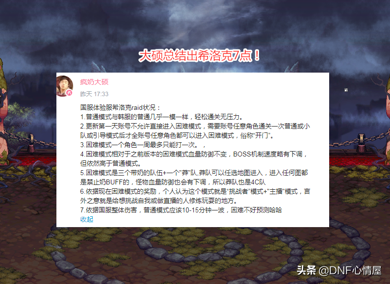 DNF:主播大硕总结希洛克7点,困难一周打一次,莽队无法带奶
