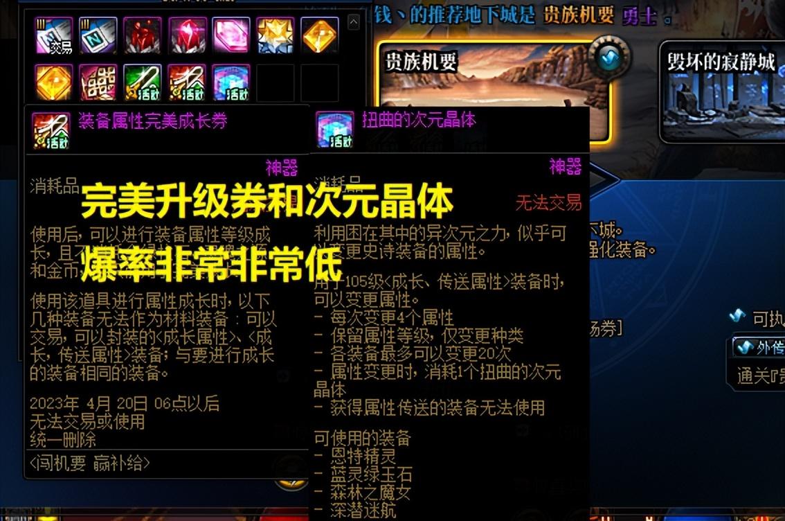 (1)本次活动专属道具有3个:普通升级券、完美升级券、以及次元晶体!但是,其中“完美升级券”和“次元晶体”的爆率非常低,到目前为止,俺都刷了几十把贵族机要了,愣是一次完美升级券和次元晶体都没遇见过。