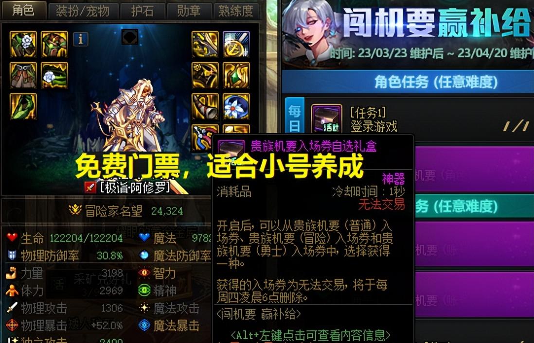 2、贵族机要非常适合用来培养小号!主要有两个好处,一是门票不花钱,每个角色每天都能领一张门票,不管你是大号养小号,还是小号养大号,只要角色足够多,基本都不会出现买票的问题,等于零成本喂养。