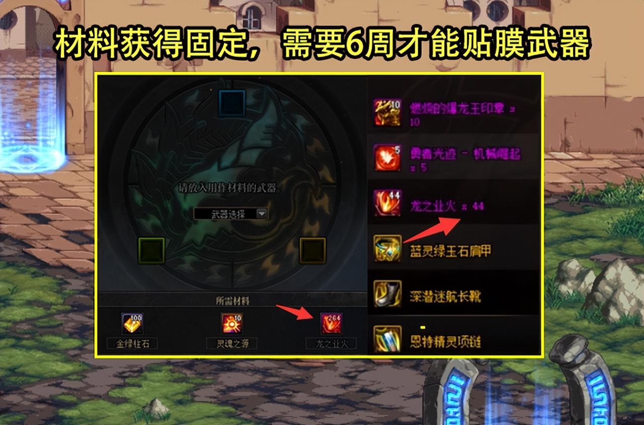 不过制作贴膜武器的时间是固定的,因为制作所需的龙之业火材料一周固定给44个,而且材料还是非账绑的,3合1融合一把贴膜武器需要264个龙之业火材料,也就是说最快需要6周的时间才能获得。