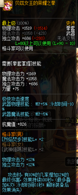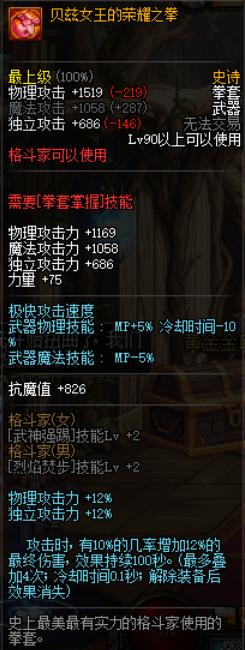 俗称娘娘拳,乌鸡专属武器,很多乌鸡玩家说没有娘娘拳就别想8个9,娘娘拳确实非常的强,二级的一觉主动,爆发超级强,配合二档伤害提升非常大,12%的物攻独立加成更是给面板非常大的提升,并且还有48%的最终伤害,这一把武器的综合提升我个人觉得完全超越荒古。