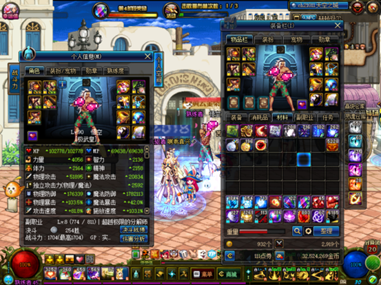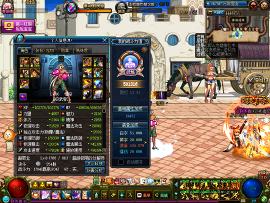 测试职业为,极武皇。装备为一套增幅+11超大陆,增幅+12恍惚+二神器+混沌。90ss武器是+13娘娘拳和+13圣耀拳套。(娘娘拳本身高所攻,因为穿超大陆,所以差距会稍大)。