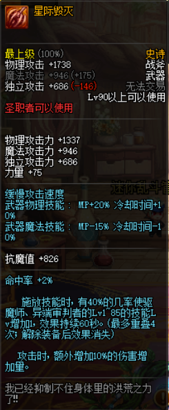 有人会问了,这一把武器只有10%的追加黄字,有什么逆天改命的,不过大家看清楚,技能1-85级有40%的几率增加,并且持续时间60秒,重要的是可以叠加4次,相当于4级的1-85级技能等级加成,这个加成完全可以叫板圣耀,一斧在手,天下我有!一个拥有星级毁灭的团长和驱魔,绝对是你从未见过的职业!