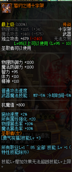 首先,武器推荐。在之前版本,其实小编是推荐90级圣物十字架或者花点钱买一个科迪十字架。不过在95版本,我们有一个更好的武器推荐,那就是哈林传说十字架——誓约之缚十字架。这个武器,我们看介绍可以看出,他能够给奶妈提供3级的勇气祝福,并且所有职业的1~85级技能加一级。所以实际上,它能够给奶妈提供4级的勇气祝福。这个提升,对于奶妈的奶量来说,不可谓不大。而且,还能提供一级的太阳等级,可以说是小号最佳的装备了。同理,奶爸的技能加成也是一样的,4级荣誉祝福,然后1~85级技能加一级。唯一美中不足的地方就是,哈林传说武器不能升级到哈林史诗武器。