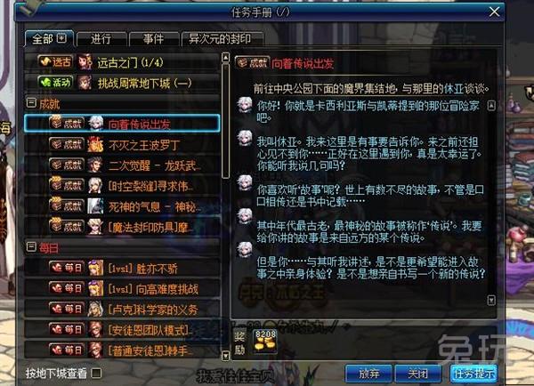 打开任务手册,找到新增的传说任务——“向着传说出发”,然后从中央公园赛丽亚房间出来就能看到那个门了,进去找NPC休亚完成任务即可看到副本。
