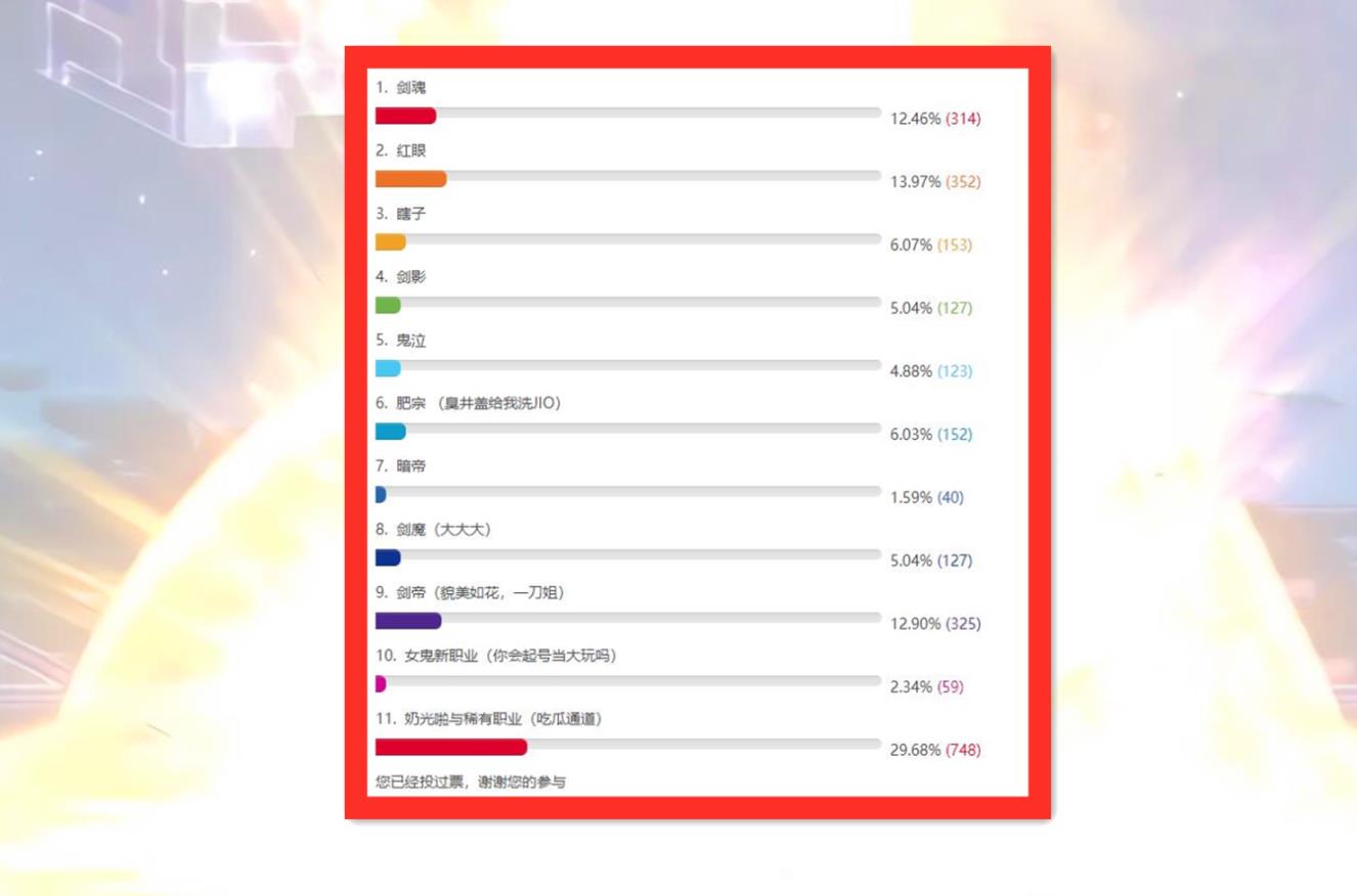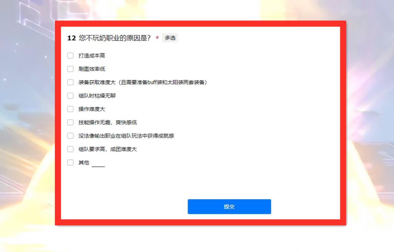 这次问卷针对玩家主玩的职业,以及为何玩这个职业做了统计,同时对为何不愿意玩奶的问题,也做出了一次详细的调查。不少玩家在此表述了自己的想法,基本跟问卷里的选项一致:奶系职业玩法枯燥,打造成本高,并且毫无操作可言,自然没有人愿意玩。