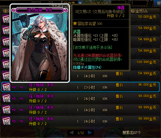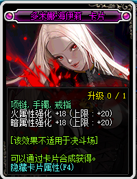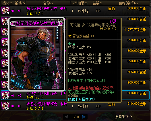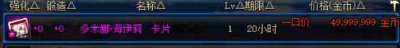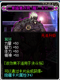 目前dnf副本产出的卡片中最贵的一张了,提升+50的四维属性,卡恩宝珠都比不过,产出于卢克副本,不过在卢克raid开放后产出制造者卢克(光)卡后,价格会有所下降;目前价格约为2e左右