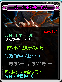 物理攻击力+45的属性加成,对于百分比职业来说,堪称神器,在dnf中,对于物理百分比职业来说,除了卡恩宝珠之外,最好的就是魂·虫王戮蛊卡片,产出与悲鸣洞穴,价格约7000w;