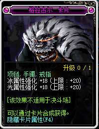 增加45点的独立攻击力和15点的力量,与物攻卡一样升级可以达到50点的独立和20点的力量,这一张卡片对红眼来说非常不错,可以附魔武器,上下装。与这张卡片类似的还有