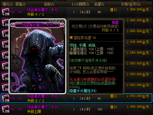 这两张可以加成全属强的卡片,也非常稀有,格拉古尔产出于兽人峡谷,多米娜海伊莉产出于恐怖的栖息地;两张的价格约4500w,上下波动500w,根据时间段内的产出量波动;
