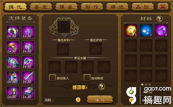 先选一个白色装备,再强化,在强化过程中点你有强化的蓝色或紫色装备一、先去买一件1级的白装。