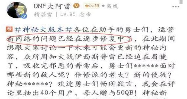 最让玩家生气的就是,其他游戏如果出现了什么网络问题之类的故障,官方都会对玩家进行一些补偿,但是DNF这个游戏却一直非常刚从来没看到过给玩家补偿过什么,毕竟这种情况出现的一直太频繁了,如果每次都给补偿的话,那就一直送送送吧,根本没有办法吧。