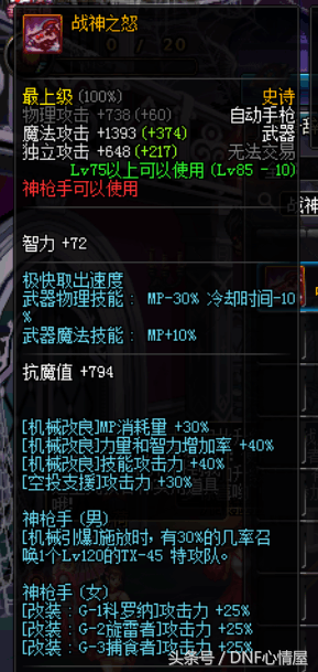 战神之怒,想要成为一个伤害爆炸的机械,那么这把史诗换装武器绝对不可缺少,不仅加成机械改良技能力智40%,还加40%的攻击力,甚至对于女机械来说,还能加成G系的伤害,这无疑是最强的换装武器。而机械对这把武器的渴望超乎你的想象,有这把换装武器的机械和没有这把武器的机械,伤害则相差很大。