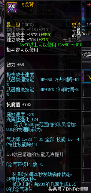 飞龙翼,这是一把特定的史诗武器,而且对于气功师来说,这把武器绝对是梦寐以求,这把史诗武器能增加20-35的技能+4,对于气功师的BUFF,这无疑是比较强的。当然,这里想要说一下,气功师光之兵刃这是15级技能,所以这对于女气功这把武器并不是很强。但是,对于男气功来说,不仅增加念气环绕,还有烈日光辉和风之息的加成,所以,这把武器对于男气功绝对是比较强的换装BUFF武器。