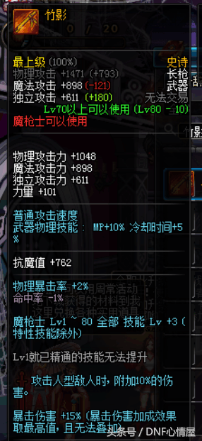 竹影,这把是魔枪士的换装史诗武器,魔枪士1-80技能+3,这就比较的变态,不仅对于BUFF技能加成3级,而且还能加成主动技能,甚至还附加10%的伤害,15%的暴击伤害,这把武器不仅能换装还能输出,恐怕这是魔枪士最想要的一把换装史诗武器。不过,这把史诗武器只能通过特定的NPC掉落,所以,出货率比较的低。