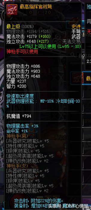最高指挥官战弩,这把85级史诗手弩对于弹药来说,还是比较强的,不仅加成男弹药的换装技能,还能加成女弹药的技能。甚至对于弹药的超负荷填装技能+5级,恐怕再也没有比这BUFF加成更强的史诗武器,能加五级的BUFF技能,这无疑是弹药的神级换装武器。