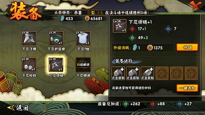 忍者苦无:进阶加成攻击力忍者护额:进阶加成攻击力和防御力忍者服