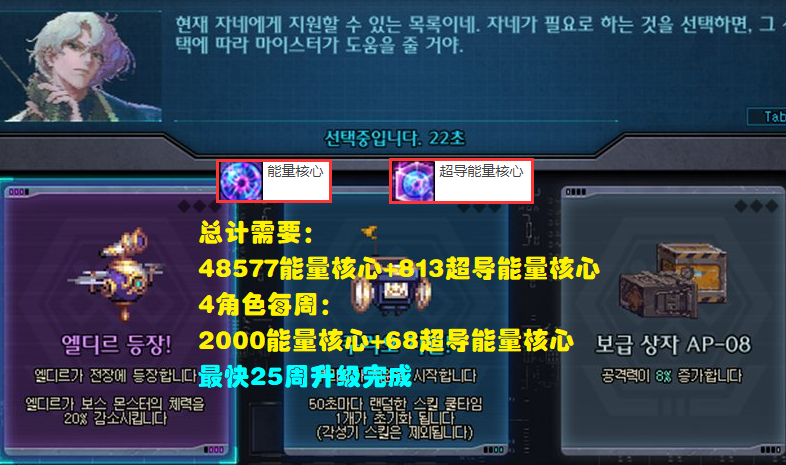 到这里结论基本上就出现了:总共需要48577能量核心,而一周最多只能获得2000个,那么就需要24.3周(实际为25周);总共需要813超导能量核心,而一周最多获得68个,那么就需要11.9周(实际为12周)。