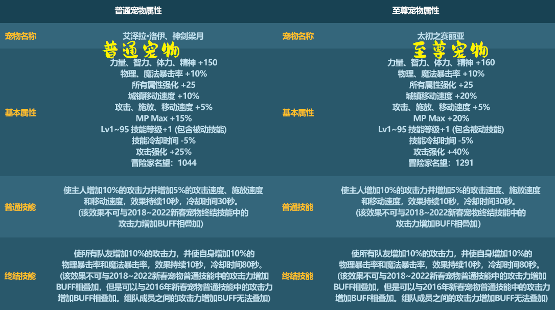 【普通:22年宠物vs23年宠物】:22年宠物+22%攻击强化,lv1-95技能+1级;23年宠物+25%攻击强化,lv1-95技能+1级;