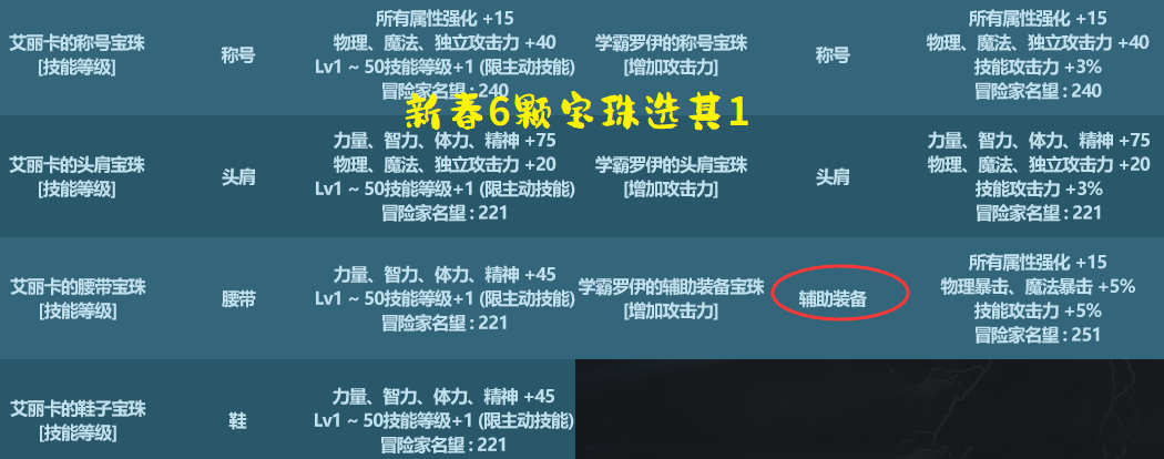 新春宝珠可选部位有:称号、头肩、腰带、鞋子、以及辅助装备。 不过相比于去年而言,只有一个部位得到了提升,那就是辅助装备!