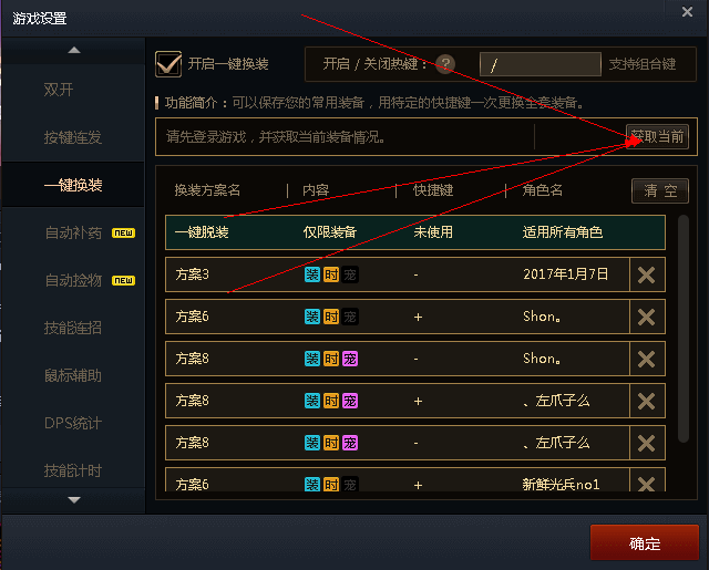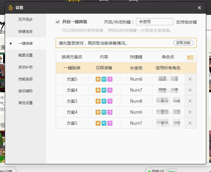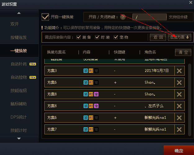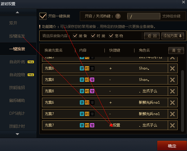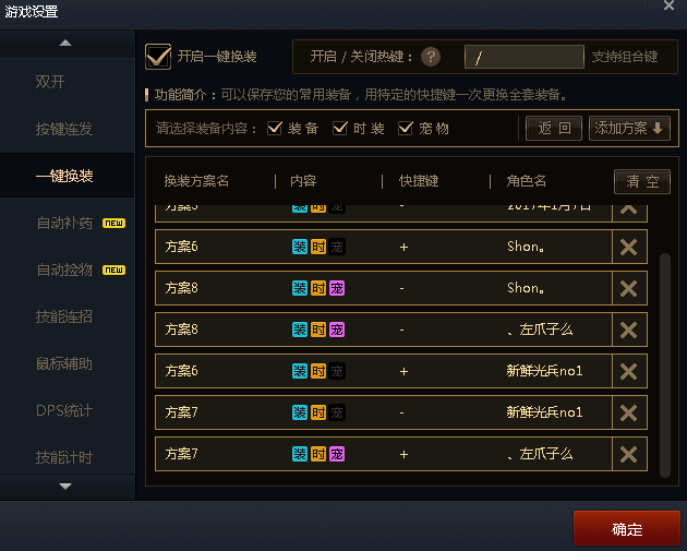 温馨提示,如图,每个角色设置两个快捷键,一个正装,一个换装,可以重复设置的,而且一次设置,换电脑也可以用。