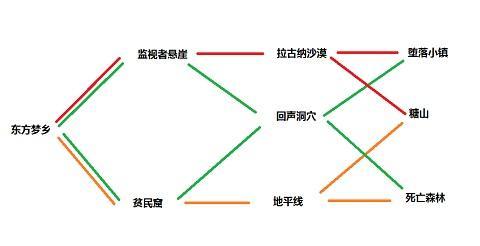 可以看到没有任何交集的就是拉古纳沙漠和地平线两个区域了,根据你的任务选择上路或下路即可;堕落小镇和死亡森林无论你走上还是走下都可通过回声洞穴中转到达,但是需要注意的是回声洞穴和糖山虽在一条水平线上,但是二者之间没有路线连接;糖山只要不走回声洞穴都可以抵达。