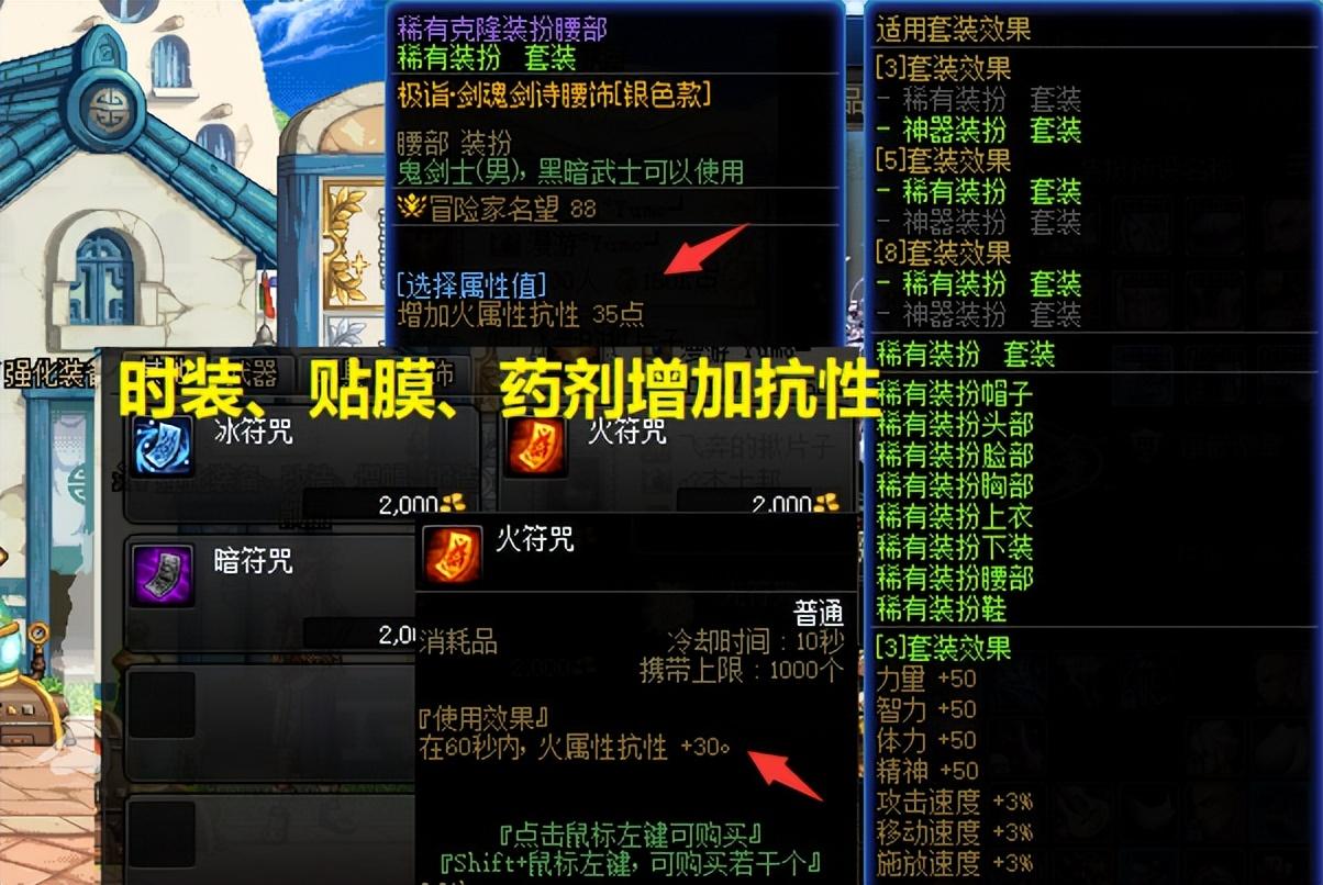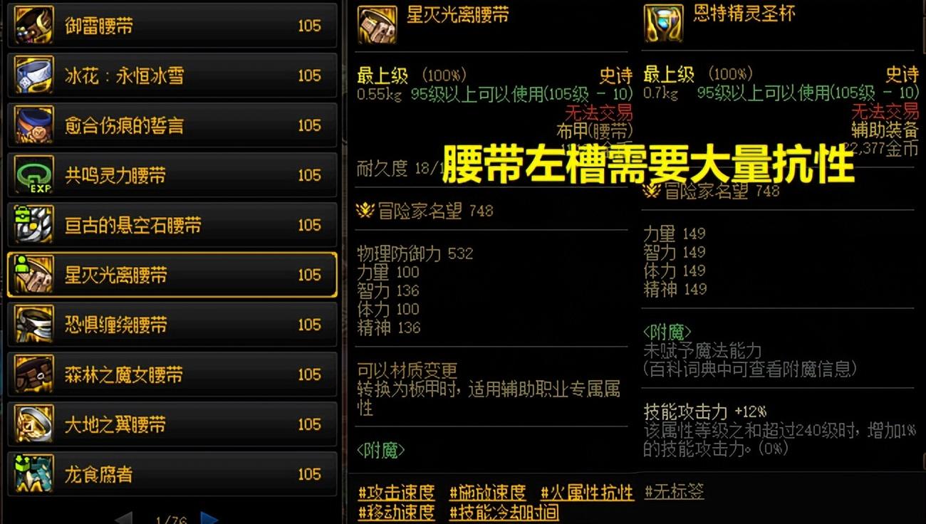 二是时装腰带,可以选择35/45单抗性,一般推荐火炕,用来触发星光腰带;三是吃药,如果实在凑不齐抗性,那么推荐火符咒、冰符咒、暗符咒、光符咒、以及水果酒,前面4个加30单抗,水果酒加30全抗性。