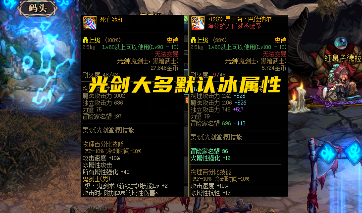而在整个过程中,90级史诗武器“死亡冰柱”,因为自带冰属性攻击和冰强,更是起到了推波助澜的作用(剑魂玩家居功至伟),以至于即便到了现在,大家似乎默认为,冰属性依然是最好的属性。