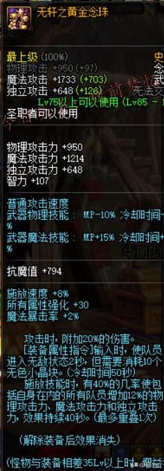 无轩念珠,释放技能能触发,给队友加12%三攻,装备属性指令 (就是开魔能的键 ,魔能都没开过的非酋自行百度)可给队友加无敌状态,触发后左下角会有无轩念珠的图标。