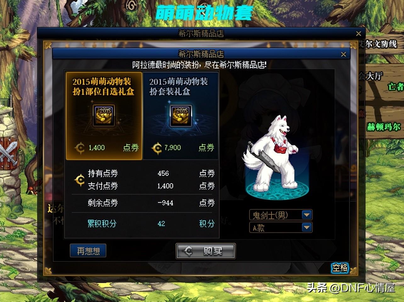 8.25版本希尔斯精品商店更新,塞入了8套绝版追忆装扮,萌萌动物套和三国套成重点。而动物套装扮,男鬼剑士职业成赢家,可以选择“白狗”!要知道这套装扮,搁在奇迹缝纫机中,最起码两三亿金币,如今大打折扣,只要79就能拿到手,激发了玩家购买的冲动。
