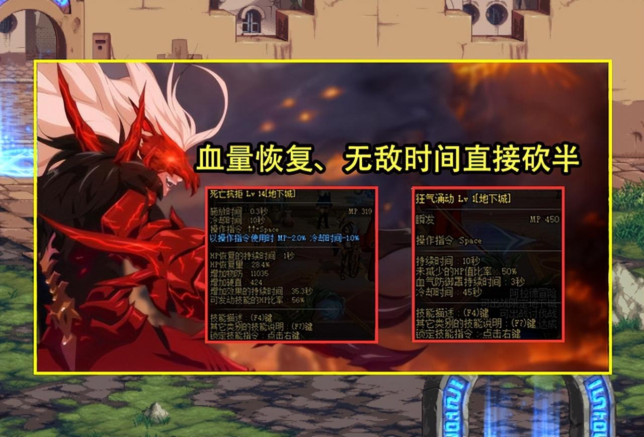 那么该怎么削弱呢?以狂气涌动为例,技能持续时间为10秒缩短到5秒,就算血量低也不会生成可以“无敌”的血气保护罩。死亡抗拒方面,加满SP和TP的情况下,HP砍半到14%,不会增加物理防御力 。