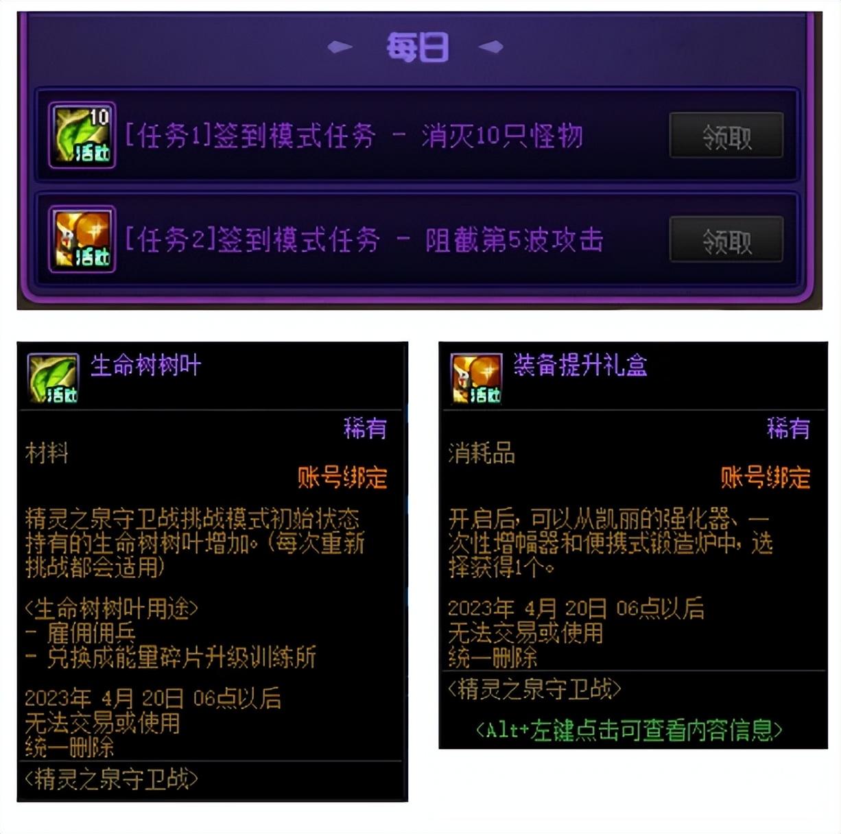 每日奖励为:10个生命树叶,1个装备提升礼盒。