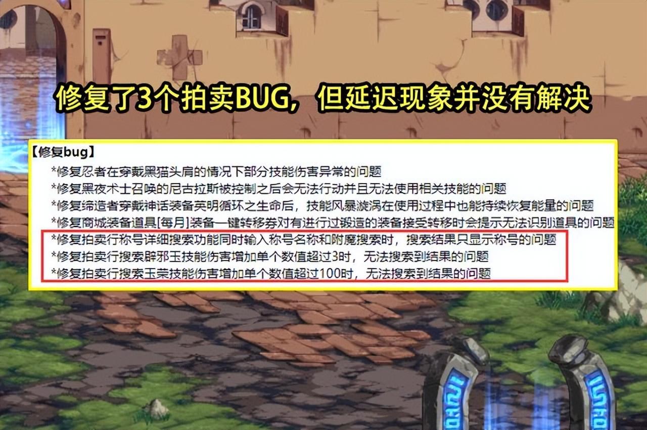 其中在这7个修复的BUG中,最受玩家嗤之以鼻的莫过于拍卖行了!拍卖行虽说修复了称号、辟邪玉、玉荣搜索这3个BUG,但是拍卖行延迟的问题并没有得到修复,已经有好几年的时间了。
