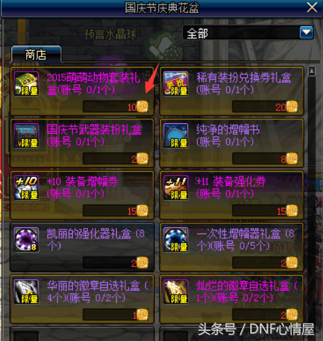 DNF中国庆花篮出售15年萌萌动物套装礼盒,动物套站街外观还是比较不错的,特别是鬼剑士职业的萌萌哒的狗套,玩鬼剑士职业的都想有一套,但是追忆动物套需要10个国庆节周商店凭证。而我们知道,购买一套国庆套赠送8个国庆节周商店凭证,一套国庆套338元,这对于一些人来说比较的昂贵,毕竟买一套国庆套已经达到极限,无法再购买第二套,但是又想要狗套,这该怎么办?