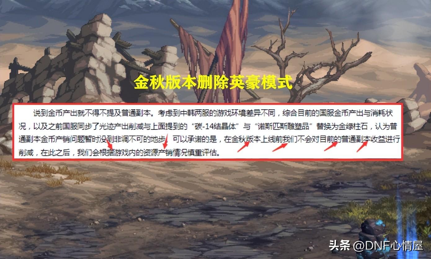 【第一大原因】:普通地下城收益削减。策划早就说过了,在金秋版本上线之前,不会对普通副本收益进行削减。但金秋版本更新后,普通副本“英豪模式”,将会全部删除。