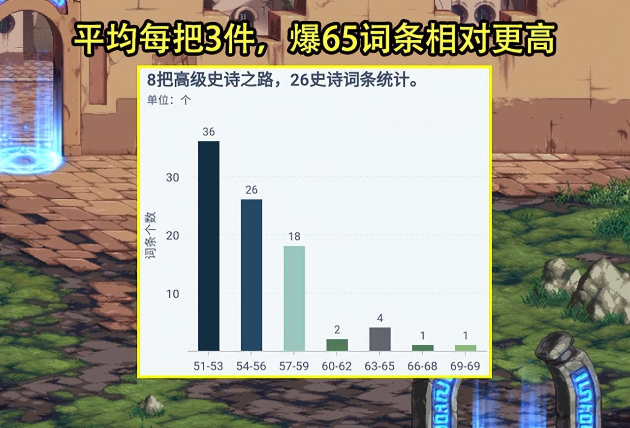 其中有51~53词条的史诗也是最多的,但是54~59词条的史诗也是紧跟其上,比普通史诗之路的爆率要高很多,并且如此,在66~69词条的史诗中,都各得1件史诗,相对词条更高。