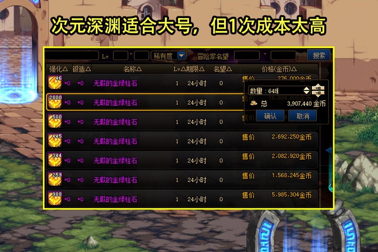不过想要给大号刷成本也是非常高的,刷一次获得3725能量,凑10W能量也就是说需要刷27次,1把24金绿柱石,27把648个,给大号刷一次需要近400W金币,要是大号全疲劳刷次元深渊需要近1亿。
