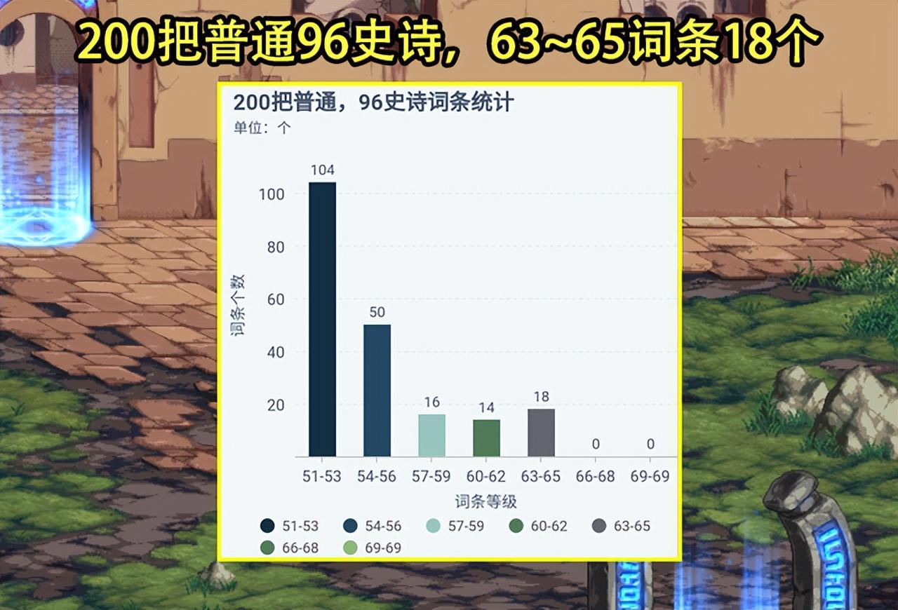 那么史诗之路爆率有多高,掉落的词条数值又怎么样呢?对此有一位玩家也是实测统计了数据,首先他测试了200把被侵蚀的次元的爆率,总共出了96件,爆率非常的高,其中在这96件史诗中,66~69词条并没有出,不过63~65词条的掉落数量还是蛮高的,比57~62词条还高,有18个 ,也难怪有玩家后悔把免费刷的指定角色给到小号上,要是给到大号上恐怕能提升不少名望。