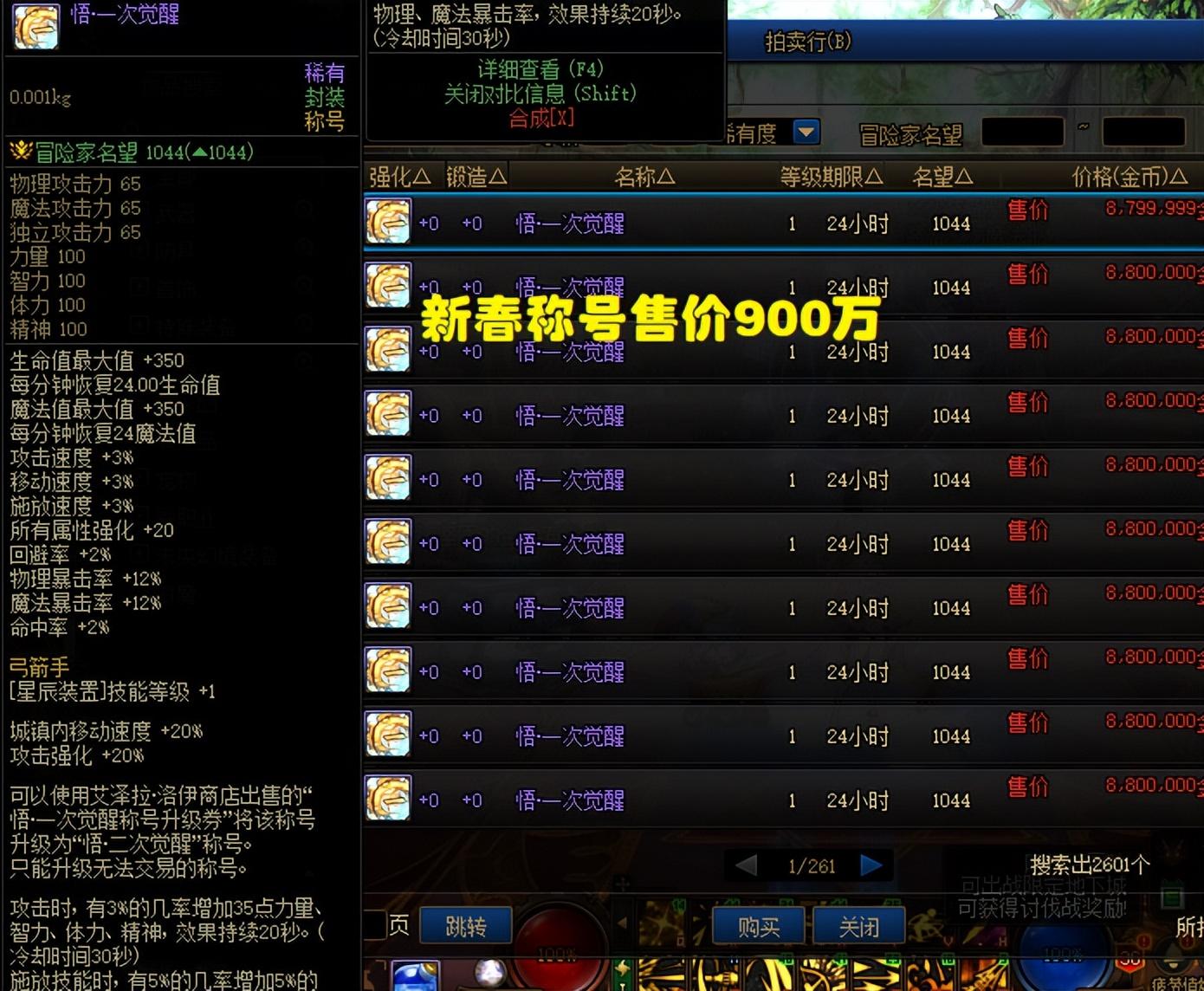 【悟-一次觉醒】拍卖行售价900万金币,三攻+65,四维+100,速度+3%,属强+20,攻击强化+20%,攻击时3%概率增加35四维。