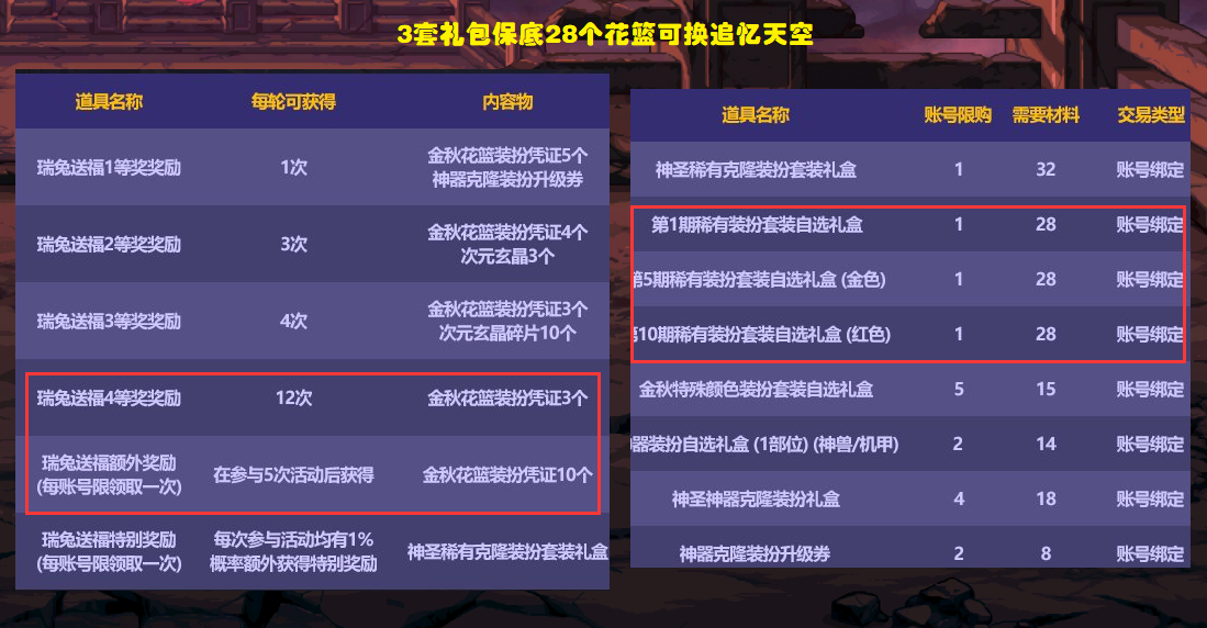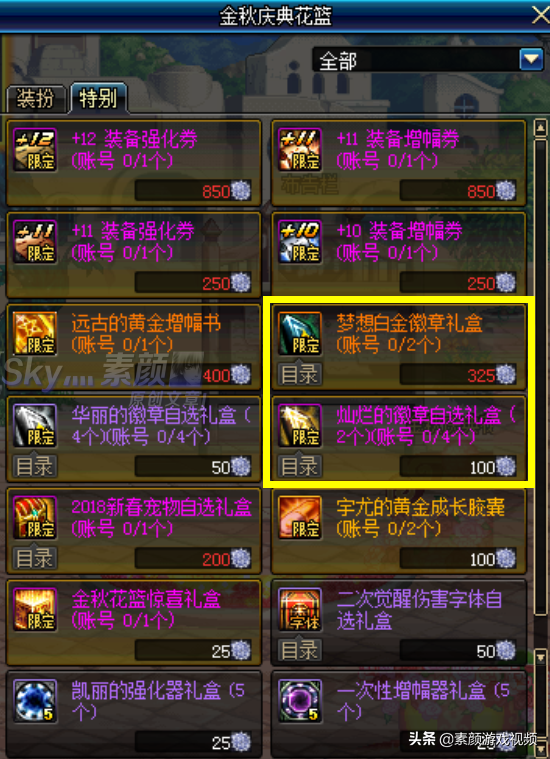 [特别花篮]: +12强化券、+11强化券,+11增幅券、+10增幅券(均限1个);远古的黄金增幅书(强打红字,且随机增幅+9~+12,限1个);白金徽章自选(限2个),2颗灿烂徽章自选(限4个),4颗华丽徽章自选(限4个);2018新春宠物(限1个),黄金成长胶囊(10级以下角色使用,直接升到95级,限2个);金秋花篮惊喜礼盒(可随机获得花篮中所有道具,限1个);二觉伤害字体、强化/增幅器。