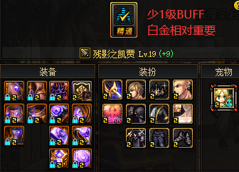 如果小伙伴们的登记BUFF装肩腰鞋有技能宝珠,光环、BUFF时装上衣、宠物都有,那么就可以轻松达到19级,此时只要拥有1级BUFF称号(非常便宜)即可,这样的话笔者就不推荐白金选择BUFF了,可以优先给到被动技能,提升会更大。