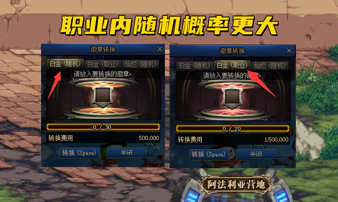4、“徽章转换”活动,有2种方法都可以转换出白金徽章,一个是全职业随机,每次50万金币,一个是本职业内随机,每次150万金币。