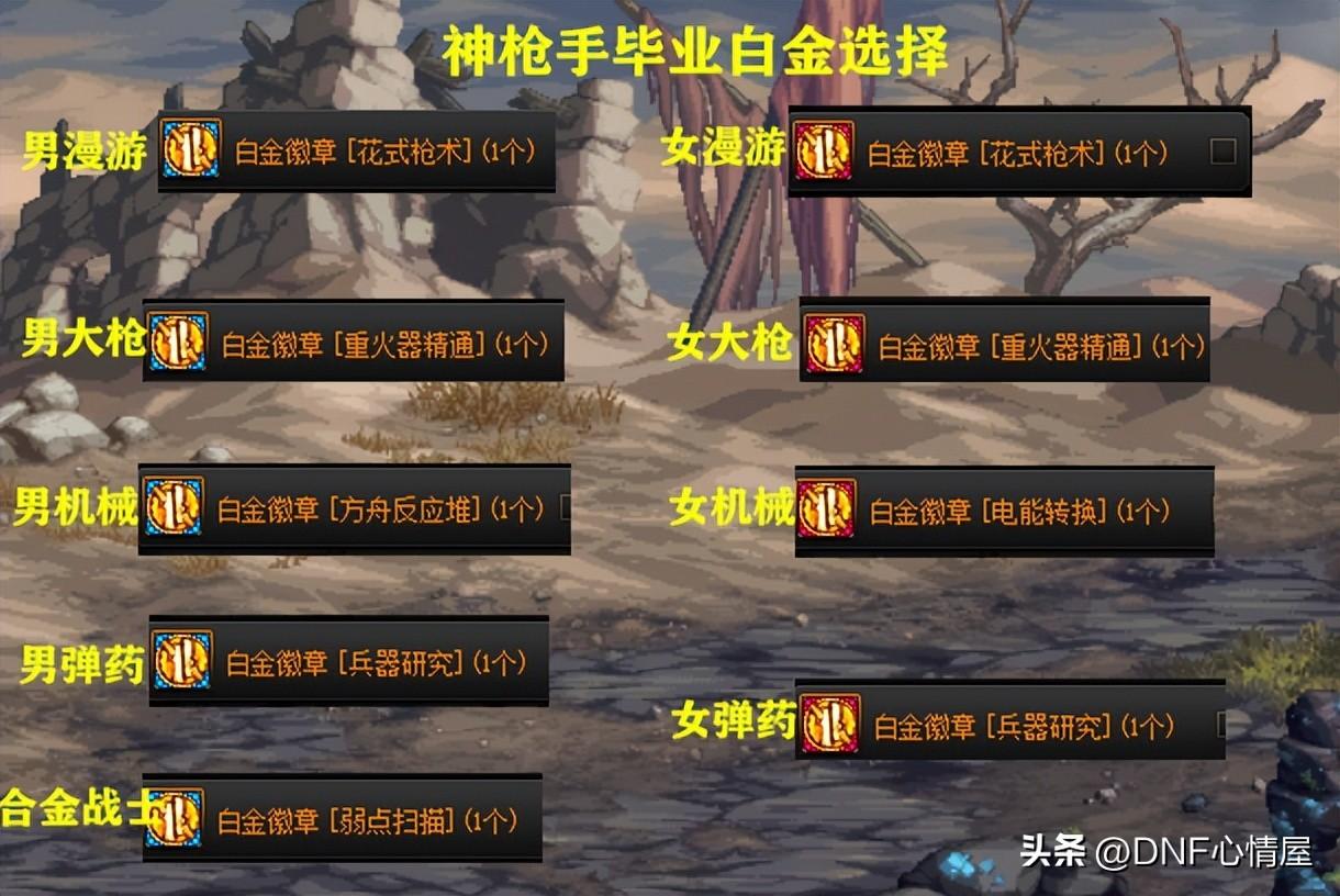 【神枪手毕业白金选择】:男枪手职业,男漫游“花式枪术”,男大枪“重火器精通”,男机械“方舟反应堆”,男弹药“兵器研究”,合金战士“弱点扫描”。