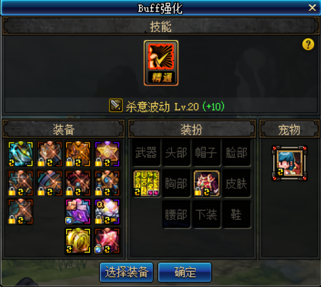 三:高级时装相信大家肯定每个人都有,有一个BUFF技能的时装就可以,技能等级+1;