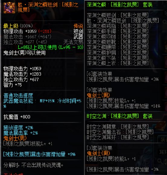 新版传说换装提升量是多少呢?武器使用胜:深渊之鳞短剑,可以增加1级残影之凯贾的技能攻击力,额外增加9%的暴击伤害 ;防具首饰和武器组成的深渊之鳞6件套,可以增加3%暴击伤害,9件套增加1级残影之凯贾的技能等级,额外增加14%的暴击伤害 ;特殊装备使用时空之渊,增加1级残影之凯贾的技能等级和3%暴击伤害 。