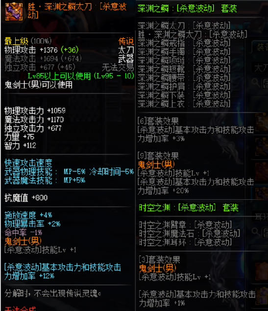 新版传说换装提升量是多少呢?武器使用胜:深渊之鳞太刀,可以增加1级的杀意波动技能等级,额外增加12%的技能攻击力增加率 ;防具首饰和武器组成的深渊之鳞6件套,可以增加3%的技能攻击力,9件套增加1级杀意波动技能等级,额外增加20%的技能攻击力 ;特殊装备使用时空之渊,增加1级杀意波动技能等级,额外增加1%的技能攻击力 。
