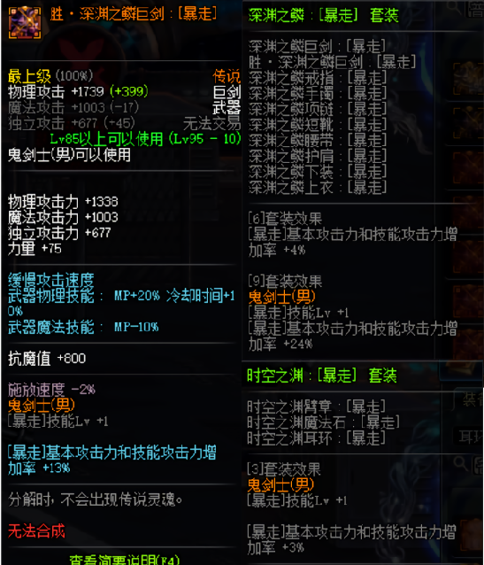 新版传说换装提升率是多少呢?武器使用胜:深渊之鳞巨剑,属性是增加1级暴走等级,13%的技能攻击力 ;防具和首饰以及武器组成的深渊之鳞6件套增加4%技能攻击力 ,9件套增加1级暴走技能等级和24%技能攻击力 ;特殊装备选择时空之渊三件套,可以增加1级暴走等级和3%技能攻击力 。
