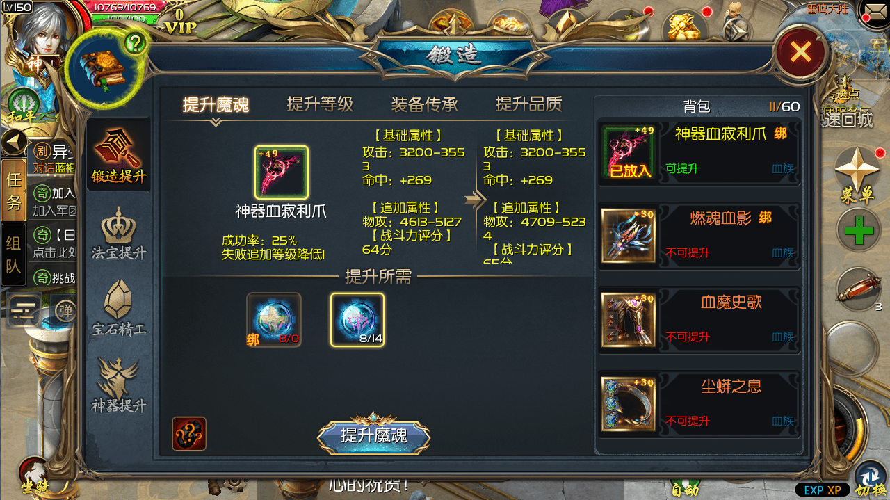 后面就比较难升了,但是它这个失败是不会掉装备等级的,更不会被毁,后面你就用幻魔之心去升,100%的成功率。